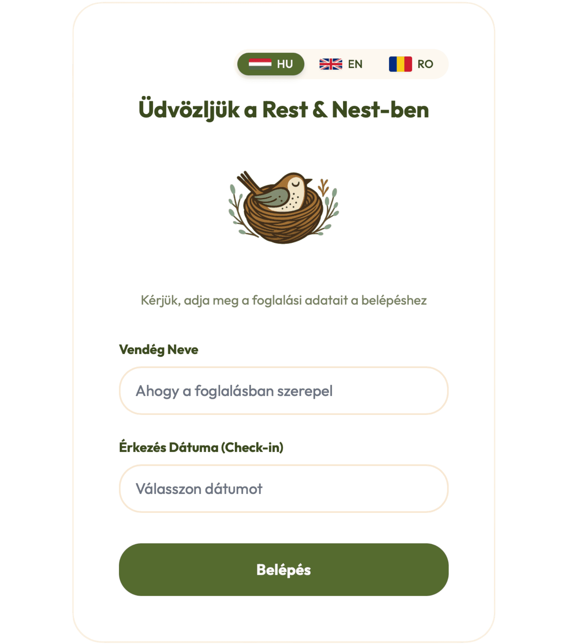 A foglalás után a vendég egy egyedi, mobilbarát portálra érkezik. Itt adják meg a számlázási és NTAK/VIZA adatokat, amiket a rendszerünk automatikusan feldolgoz. A check-in idején a portál feloldja a zárolásokat, és a vendég azonnal megkapja a pontos bejutási információkat. Nincs szükség kulcsátadásra, nincs várakozás.