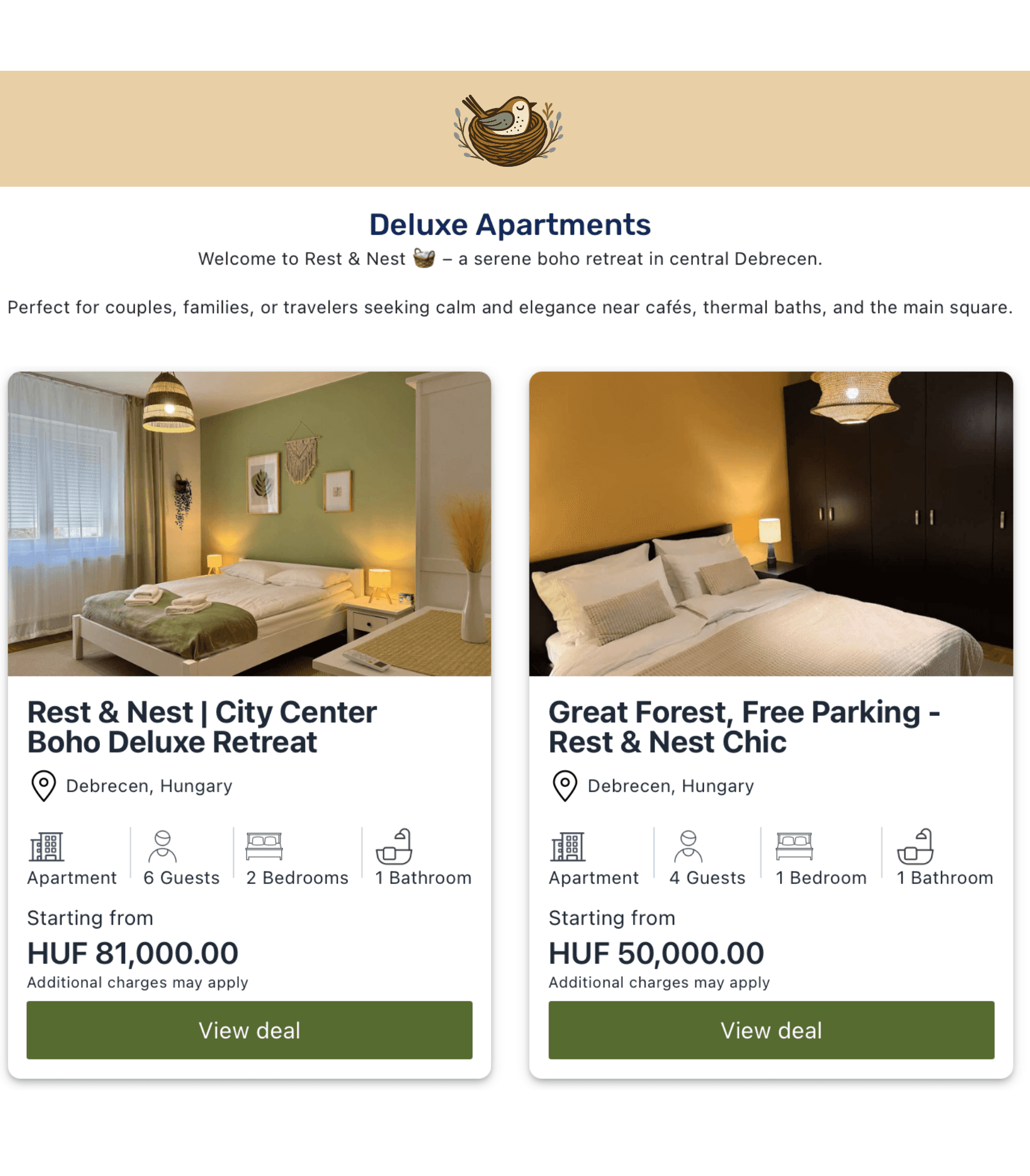 Minden ingatlanunk kap egy saját, folyamatosan frissülő, profi foglalási oldalt. Ezzel direkt foglalásokat generálunk, megkerülve az Airbnb és Booking jutalékait. Így több profit marad az Ön zsebében, miközben a vendégélményt már a foglalás pillanatától mi kontrolláljuk.